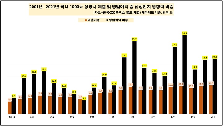 지난해 삼성전자가 달성한 30조원이 넘는 영업이익 규모는 같은 기간 1000대 기업 전체 금액 중 22%를 차지했다. 같은 기간 1000대 기업 내 삼성전자의 매출 비중 11.5%보다 10% 이상 높은 수치다. 2001~2021년 사이 1000대 기업 내 삼성전자의 영업이익 비중은 2008년 5.7%로 가장 낮았고, 2018년 31.6%로 영향력이 가장 컸다.