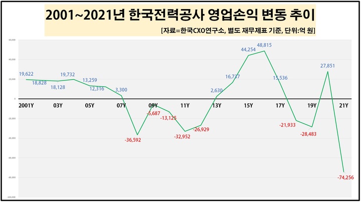 한전의 경영 체력 성적표가 저조한 것은 이번이 처음은 아니다. 지난 2001년부터 2021년 사이 중 1조원 넘는 영업적자를 기록한 횟수는 7번이나 됐다. 특히 2008년부터 2012년까지는 5년 연속으로 영업손실에서 벗어나지 못한 적도 있었다. 2008년부터 5년 간 손실 본 누적 영업적자만 해도 11조5000억원을 넘었다.