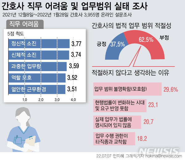 응답한 간호사 62.5%는 현행법상 간호사의 업무범위가 적절하지 않다는 부정적 응답을 내놨다. '현재 법적 업무 범위가 모호하다'는 응답이 29.6%로 가장 많았고, '현행 법률이 변하는 시대와 요구를 반영하지 못한다'는 응답이 23.1%로 나타났다. '실제 업무가 법률에 명시돼 있지 않다'는 응답이 20.7%, '업무수행 권한이 타 직종과 교착된다'는 응답이 18.2%였다.