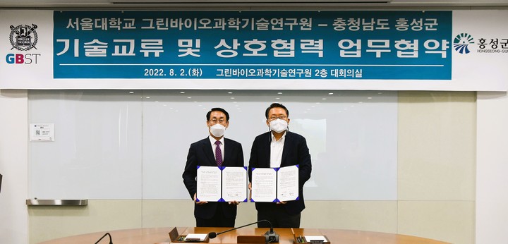 홍성군은 2일 서울대학교 그린바이오과학기술연구원(원장 임정빈)과 ‘농업분야 기술 교류 및 상호협력 증진’을 위한 업무협력 양해각서(MOU)를 체결했다.