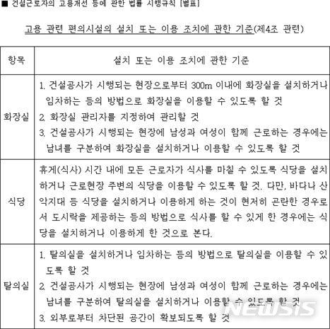 현행법에 따르면 대통령령으로 정하는 규모 이상의 건설공사가 시행되는 현장에서는 화장실, 식당, 탈의실 등의 시설을 설치하게 돼 있지만 자세한 규정은 고용노동부령으로 정하게 돼 있다. 또 건설노동자들이 사용할 화장실은 현장으로부터 300m 이내에 설치하거나 임차하는 등의 방법으로 설치돼야 한다.