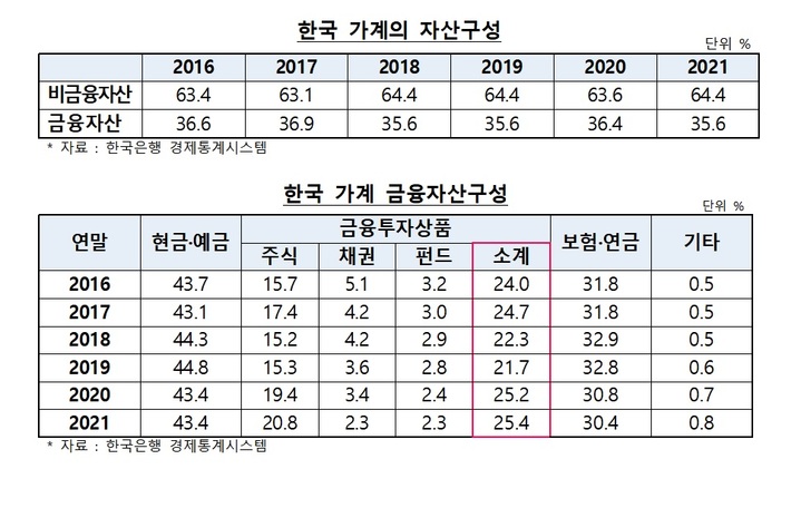 반면 금융자산 비중은 주요국 대비 낮은 편이다. 특히 미국과 영국은 금융자산이 각각 71.5%, 53.8%로 절반을 넘는 것과 대조적이다.