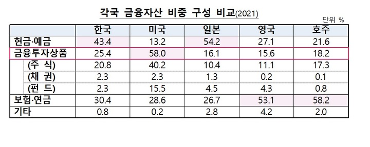 주요국 금융자산 비중을 살펴본 결과 한국과 일본은 현금과 예금, 미국은 금융투자상품, 영국과 호주는 보험·연금 비중이 높았다.