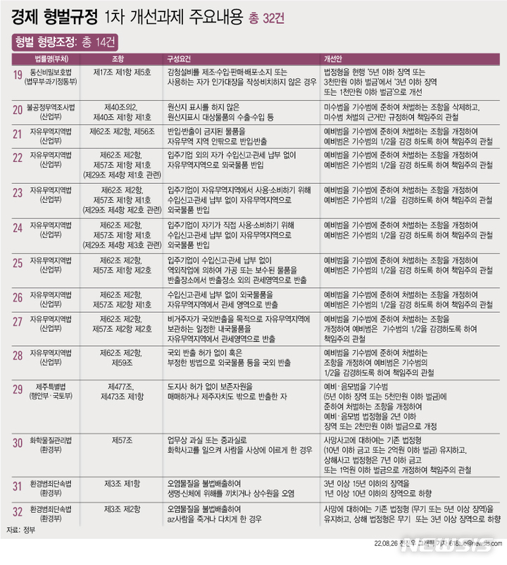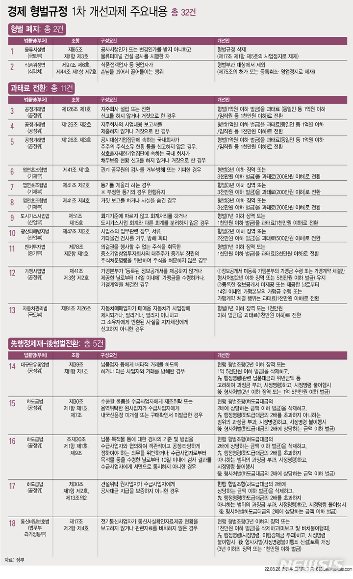 또한 정부는 기존 법률에 규정된 행정제재로 충분히 입법목적이 달성 가능한 2개의 형벌 규정에 대해 형벌조항에서 삭제하거나 형벌 대상에서 제외하기로 했다.