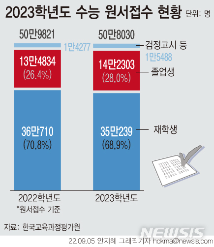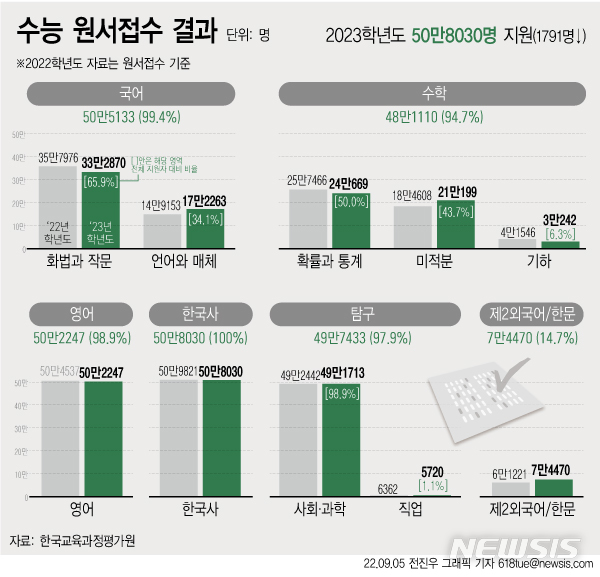 수능 출제기관인 한국교육과정평가원(평가원)이 5일 공개한 2023학년도 수능 응시원서 접수 결과, 전년도보다 1791명이 감소한 50만8030명이 원서를 냈다.