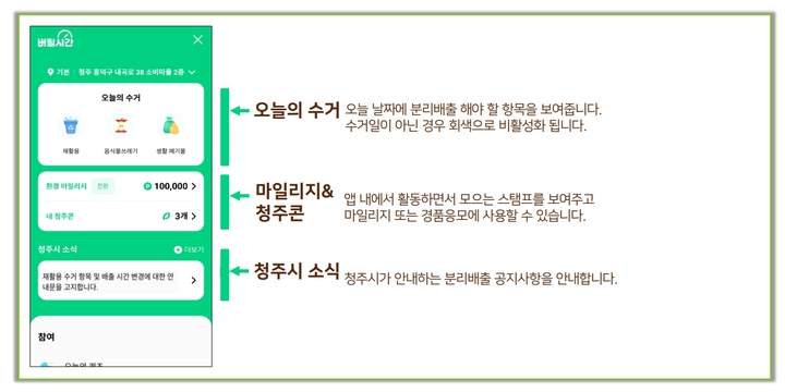 청주페이 앱 부가서비스인 '버릴시간'에 접속해 거주지를 입력하면 100m 반경의 요일별 쓰레기 수거품목과 배출시간, 배출방법을 알려준다.