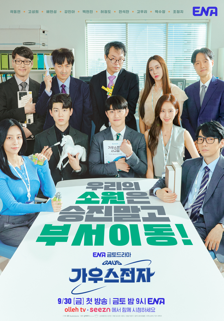14일 ENA에 따르면, '가우스전자'는 30일 오후 9시 금토극 포문을 연다. 올레tv와 seezn(시즌)에서도 공개한다. 대기 발령소로 불리는 생활가전본부 마케팅 3부 청춘들의 사랑 이야기다. 동명 웹툰을 원작으로 한다.