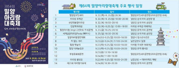 [밀양=뉴시스] 안지율 기자 = 코로나19로 중단됐던 제64회 밀양아리랑대축제가 3년 만에 오는 22일 성대하게 막을 올린다.