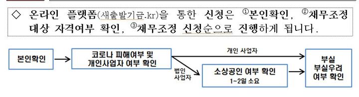 온라인 플랫폼을 통한 신청은 본인확인, 채무조정 대상 자격 확인, 채무조정 신청순으로 진행된다. 온라인 플랫폼을 통해 신청하려는 자영업자·소상공인들은 접속 전 본인확인, 채무조정 대상 자격 확인, 채무조정 신청에 필요한 사항을 미리 준비하는 것이 좋다.