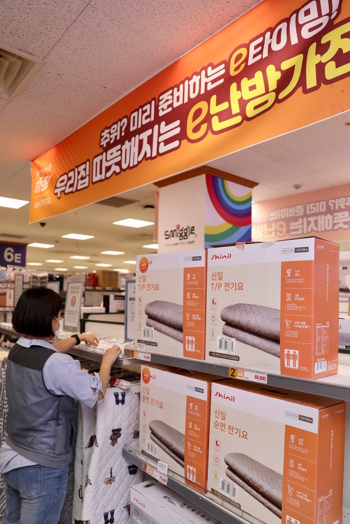 면혼방 원단을 사용해 촉감이 부드러운 '신일 T·C 데칼 전기요(싱글·더블)’를 각각 1만원 할인한 6만9000원, 7만4000원에 판매하고 ‘경동나비엔 온수매트 EQM541(싱글·퀸)’는 행사카드로 결제시 각 10만원 할인한 24만9000원, 26만9000원에 판매한다.