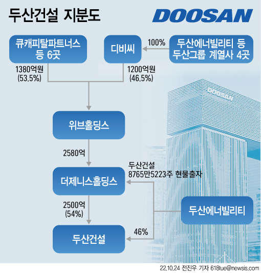 두산그룹 관계자는 "두산건설을 그룹에서 떼내야 했는데 그러려면 두산그룹 계열사들이 설립한 디비씨가 두산건설 인수 주체인 더위브홀딩스에 1200억원을 출자하는 방법밖에 없었다"며 "큐캐피탈과 두산그룹은 아무런 연관도 없다"고 밝혔다.