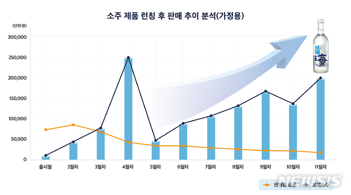 보해소주는 출시 첫 달 약 1만병의 판매고를 올렸지만 5개월 만에 12만병대로 10배 이상 급증했다. 출시된 지 1년이 지난 올 여름에는 첫 달 대비 20배가 넘는 판매를 기록했다.