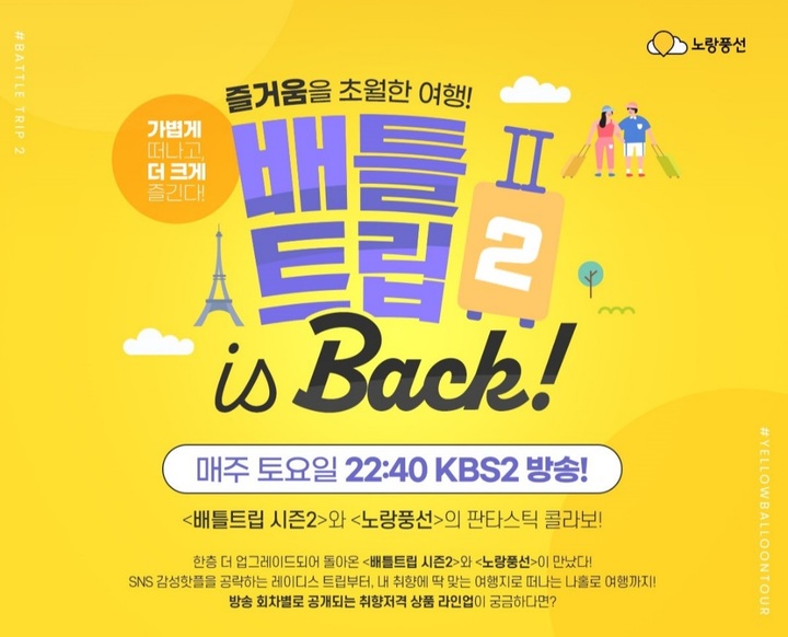 [서울=뉴시스]김혜경 기자 = 노랑풍선은 KBS 2TV 예능프로그램 '배틀트립2'와 손잡고 방송에 나온 여행지를 소개하는 다양한 기획전과 이벤트를 진행한다고 14일 밝혔다.
