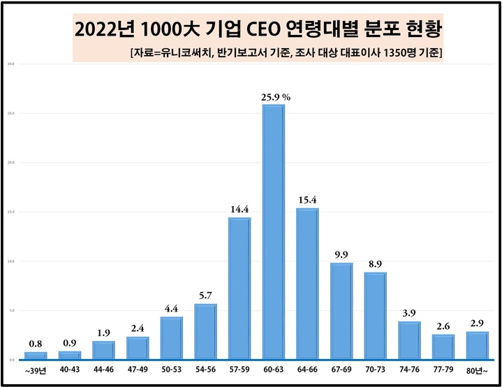 1000대 기업 CEO들을 연령대별로 살펴보면 1960~1963년 사이 태어난 1960년대 초반생이 25.9%로 지난해 24.5%보다 1.4%포인트 높아졌다. 이어 1964~1966년(15.4%), 1957~1959년(14.4%), 1967~1969년(9.9%), 1970~1973년(8.9%) 순으로 많았다.