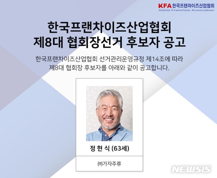 [서울=뉴시스] 김동현 기자 = 한국프랜차이즈산업협회가 차기 협회장 후보로 정현식 현 협회장을 단수 추천했다고 23일 밝혔다.