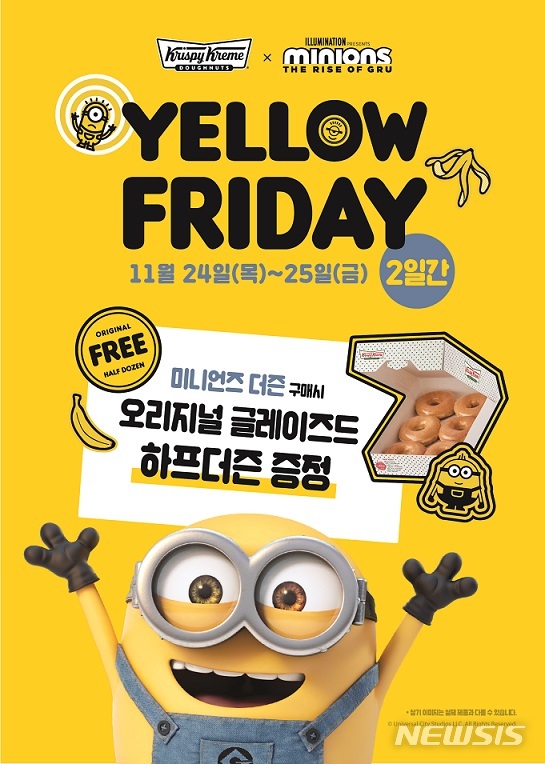 [서울=뉴시스] 김동현 기자 = 크리스피크림도넛이 오는 25일까 미니언즈 도넛을 활용한 '옐로우 프라이데이' 프로모션을 진행한다고 24일 밝혔다.