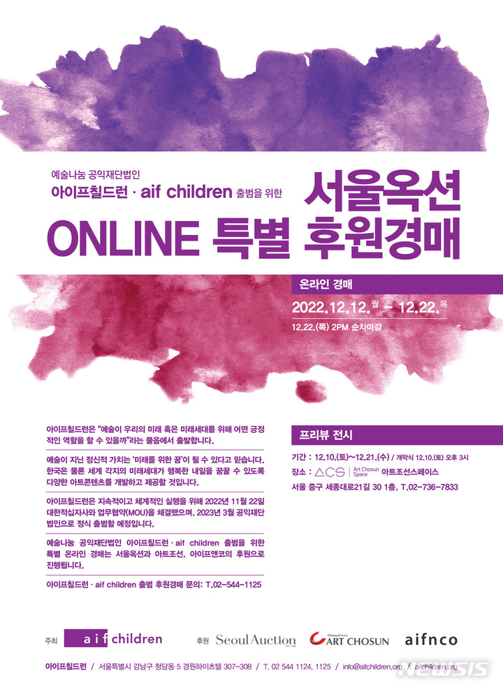 아이프칠드런 공익재단법인 출범 준비위원회 김윤섭 대표는 “예술이 지닌 정신적 가치는 ‘미래를 위한 꿈’이 될 수 있다는 믿음으로 아이프칠드런 설립을 준비했다. 한국은 물론 세계 각지의 미래세대가 행복한 내일을 꿈꿀 수 있도록 다양한 아트콘텐츠를 개발하고 제공하는 것을 목표로 삼고 있다"며 “다양한 분야의 사회구성원들이 함께 참여할 수 있는 채널을 만들어가겠다"고 전했다. 아이프칠드런은 이번 후원경매에 소장품 70여점을 내놓았다.