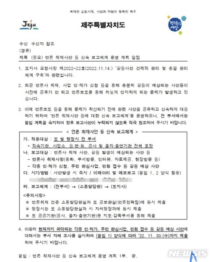 앞서 제주도는 '언론 취재사안 등 신속 보고체계 운영 계획' 방침을 담은 문서를 모든 부서에 내려보냈다. 이 문서는 제주도청 뿐만 아니라 공사 및 제주도 출자출연기관까지 송달됐다.