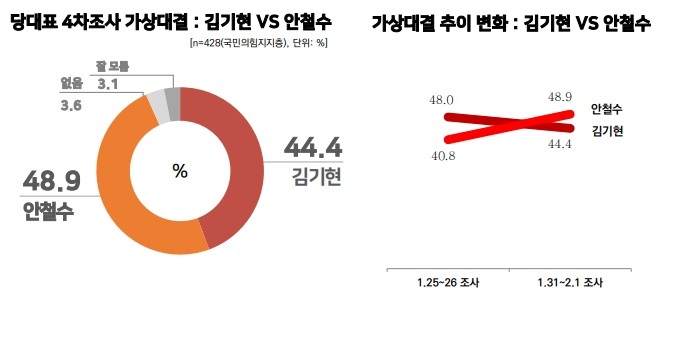 리얼미터가 미디어트리뷴 의뢰로 지난달 31일~2월1일 전국 남녀 1005명에게 실시해 2일 공개한 여론조사에 따르면, 국민의힘 지지층 428명 중 48.9%가 결선투표 양자대결에서 안 의원을 지지한 반면 44.4%가 김 의원을 지지했다. 양자간 격차는 오차범위(±4.8%포인트) 내인 4.5%포인트로 나타났다.