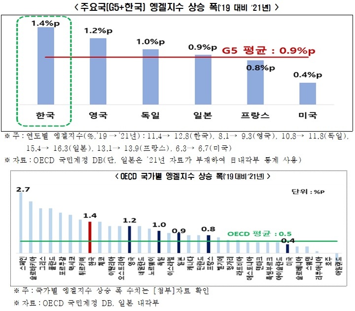 엥겔지수는 가계 전체 소비지출 중 식료품 소비지출이 차지하는 비중이다. 2019년 대비 2021년 주요국별 엥겔지수 상승폭은 한국 1.4%p, 영국 1.2%p, 독일 1.0%p. 일본 0.9%p, 프랑스 0.8%p, 미국 0.4%p 등으로 한국의 엥겔지수가 주요국 중 최대로 상승했다.