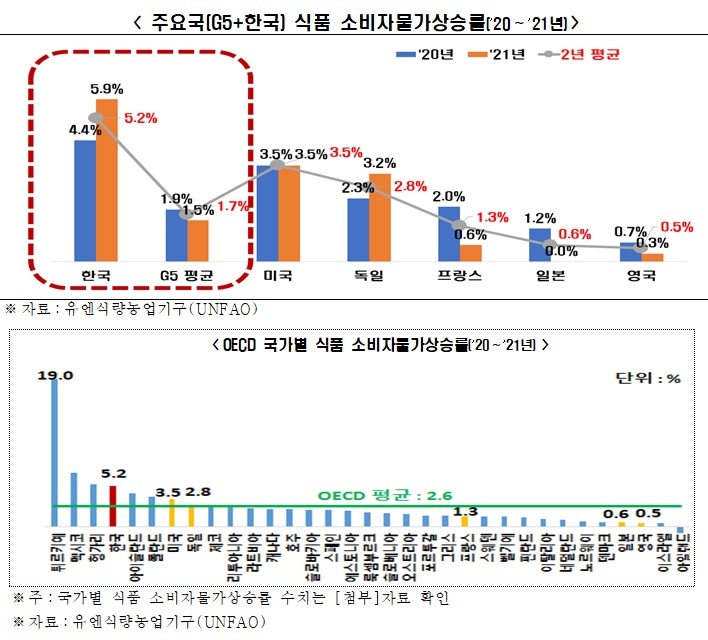 유엔 식량농업기구에 따르면 코로나 이후 한국의 식품 소비자물가상승률은 연평균 5.2%로 G5 평균 1.7% 대비 3배 이상 높았다. 국가별로 보면 한국 5.2%, 미국 3.5%, 독일 2.8%, 프랑스 1.3%, 일본 0.6%, 영국 0.5% 수준으로 한국의 상승률이 가장 가팔랐다.