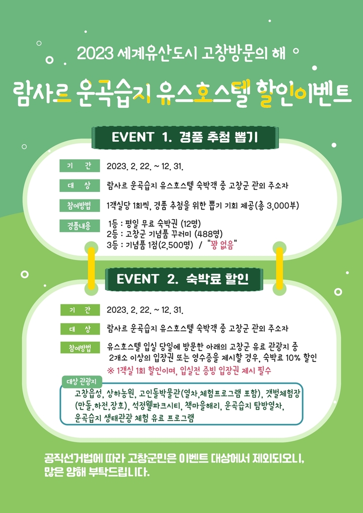 [고창=뉴시스] 김종효 기자 = 전북 고창군 '람사르운곡습지 유스호스텔'이 고창 방문의해 맞이 '경품추첨' 등 특별이벤트를 연다고 23일 밝혔다.