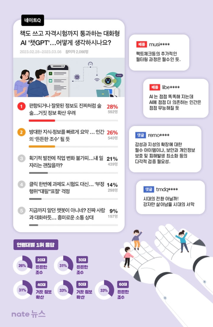 반면 전체 응답자 중 26%(540명)는 ‘방대한 지식이나 정보를 빠르게 요약해 준다는 점에서 든든한 조수 역할을 해낼 것’이라고 답해 긍정적 의견을 표했다.