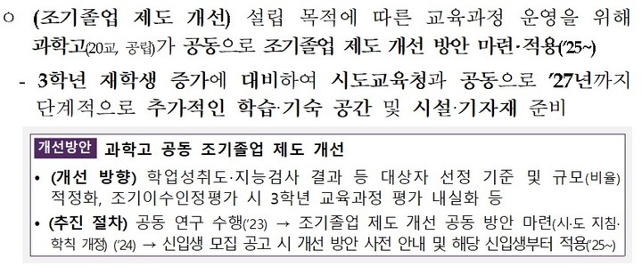 정부는 과학고와 함께 조기졸업 제도 개선 방안을 마련해 오는 2025학년도부터 적용할 방침이다. 올해부터 공동 연구에 착수, 개선 방안을 마련한다. 내년 교육청 지침과 과학고 학칙을 개선, 2025년 과학고 신입생부터 적용한다.