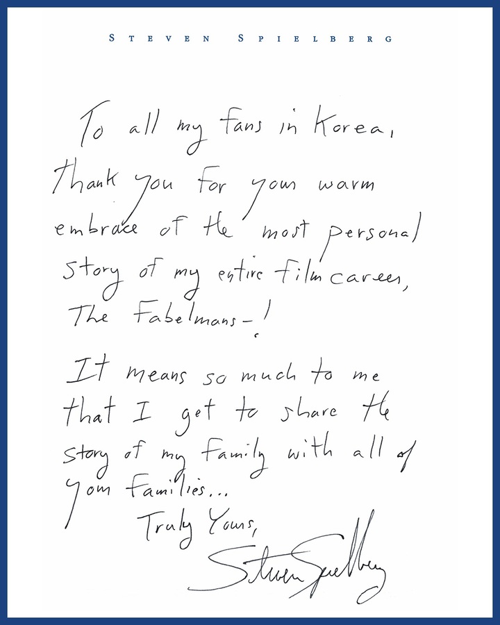 [서울=뉴시스] 손정빈 기자 = 스티븐 스필버그 감독이 새 영화 '파벨만스'를 찾아준 한국 관객에게 감사 인사를 담은 친필 메시지를 보내왔다.