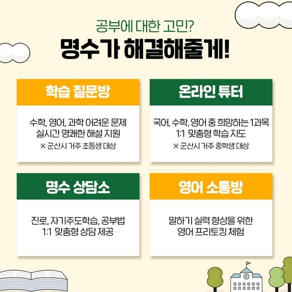 학습 질문방과 1대1 맞춤형 멘토링을 제공하는 '온라인튜터', 진로 상담·자기주도학습 공부법 등을 알려주는 '명수상담소', 영어프리토킹 체험을 할 수 있는 '영어 소통방'으로 운영된다.