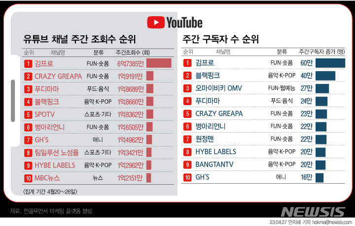주간 구독자수 1~10위는 ▲숏폼 크리에이터 김프로(60만명↑) ▲걸그룹 블랙핑크(42만명↑) ▲오마이비키(27만명↑) ▲푸드 유튜버 푸디마마(24만명↑) ▲숏폼 크리에이터 크레이지 그레빠(23만명↑) ▲숏폼 크리에이터 병아리언니(22만명↑) ▲숏폼 크리에이터 원정맨(22만명↑) ▲하이브 공식 채널 HYBE LABELS(20만명↑) ▲방탄소년단(BTS) 공식 채널 BANGTANTV(20만명↑) ▲애니메이션 유튜버 계향쓰(16만명↑)으로 집계됐다.