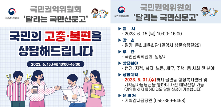 [밀양=뉴시스] 안지율 기자 = 경남 밀양시는 시민들의 고충과 애로사항 해결을 위해 오는 6월15일 오전 10시부터 오후 4시까지 밀양문화체육회관에서 국민권익위원회 주관으로 ‘달리는 국민신문고’를 운영한다고 10일 밝혔다.