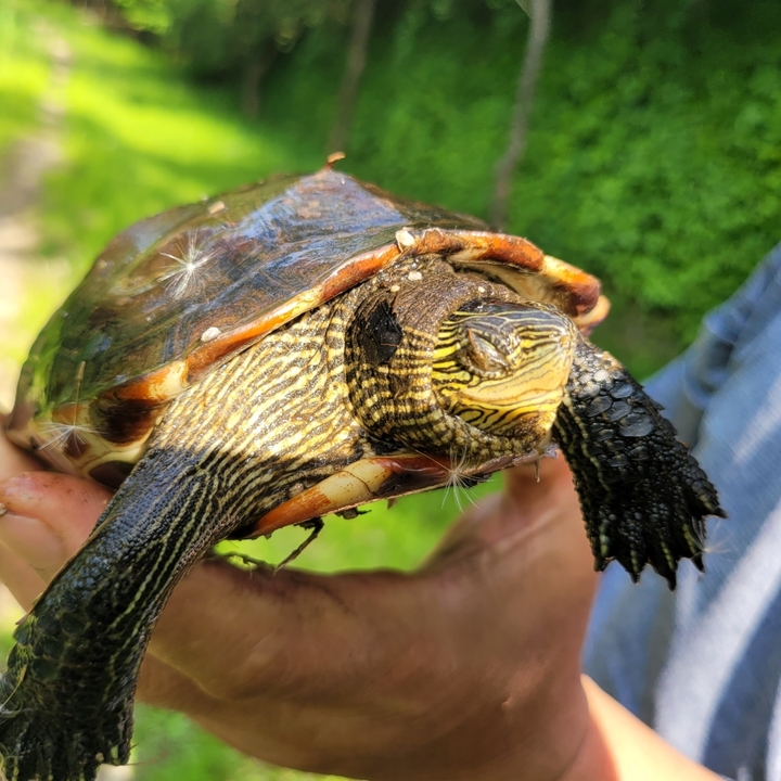 [청주=뉴시스] 임선우 기자 = 충북 청주시는 원흥이방죽에서 생태교란종인 '중국줄무늬목거북' 1마리를 포획했다고 10일 밝혔다.