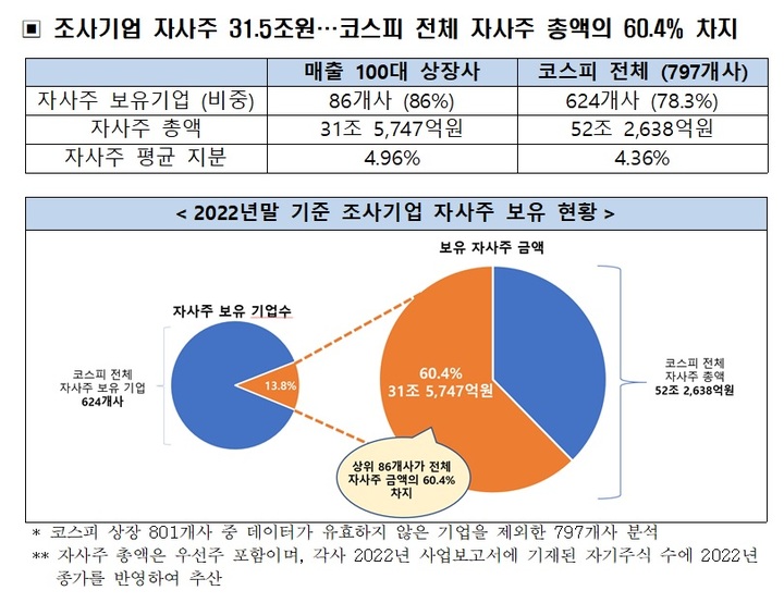 공기업·금융회사를 제외한 2022년 매출 실적 상위 100대 코스피 상장사 중 86개사가 자사주를 갖고 있으며, 금액으로는 31조5747억원어치다. 자사주 평균 지분율은 4.96%로 집계됐다. 코스피 전체로 봐도 78.3%의 기업이 평균 4.36%의 지분을 확보하고 있다.