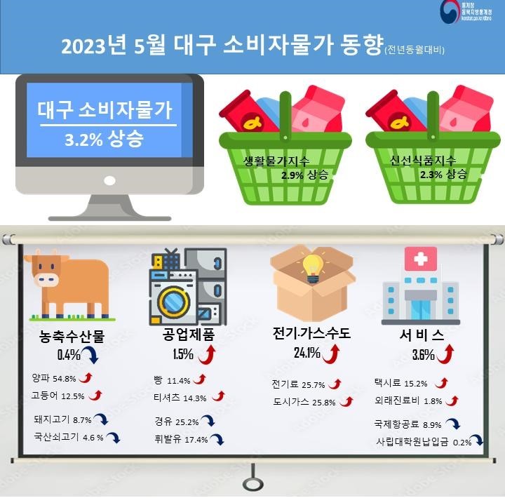2일 동북지방통계청이 발표한 '5월 대구·경북 지역 소비자물가 동향'에 따르면 대구의 소비자물가지수는 111.23(2020=100)로 전월대비 0.1% 상승했다. 1년 전보다는 3.2% 올랐다.