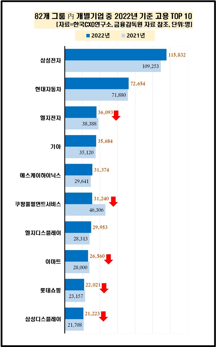 기업분석전문 한국CXO연구소는 이 같은 내용을 담은 82개 그룹 대상 2021~2022년 고용 변동 분석 결과를 8일 발표했다.