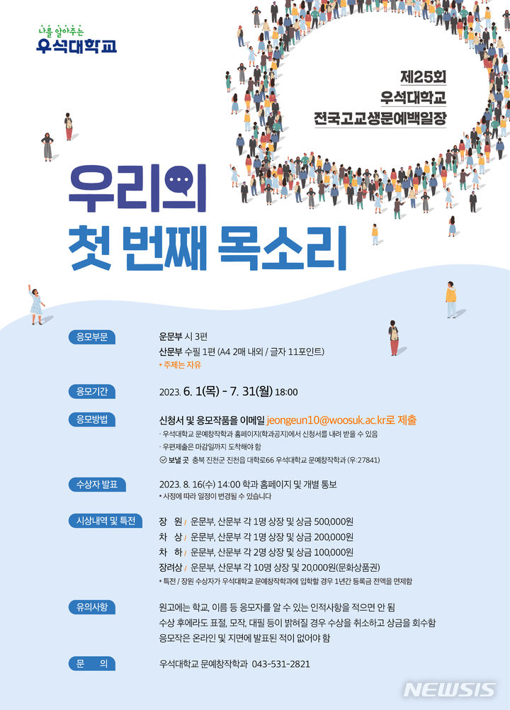 응모 기간은 오는 7월 31일까지이며, 우석대 문예창작학과 홈페이지(https://munchang.woosuk.ac.kr)에서 신청서를 내려받아 작성한 뒤 응모작품과 함께 이메일([email protected]) 또는 우편(충북 진천군 진천읍 대학로 66 우석대 문예창작학과)을 통해 제출하면 된다.