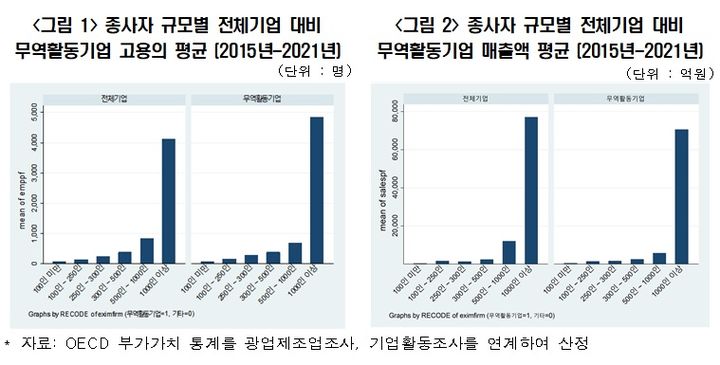 무역활동 기업 1개사당 평균 매출액은 1조4183억원으로, 산업군 평균(9039억원)보다 56.9%(5144억원) 많은 수준이다. 고용수준도 산업군 전체기업 평균(562명)보다 90.7% 많은 1072명으로 집계됐다.