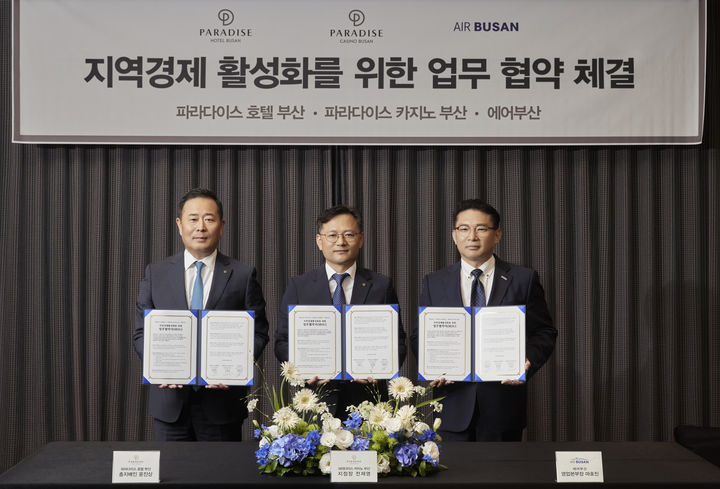 [부산=뉴시스]원동화 기자 = 부산을 대표하는 항공사인 에어부산과 해운대 대표 호텔인 파라다이스 호텔 부산, 파라다이스 카지노 부산이 전략적 파트너십 구축을 위해 업무협약을 체결했다.