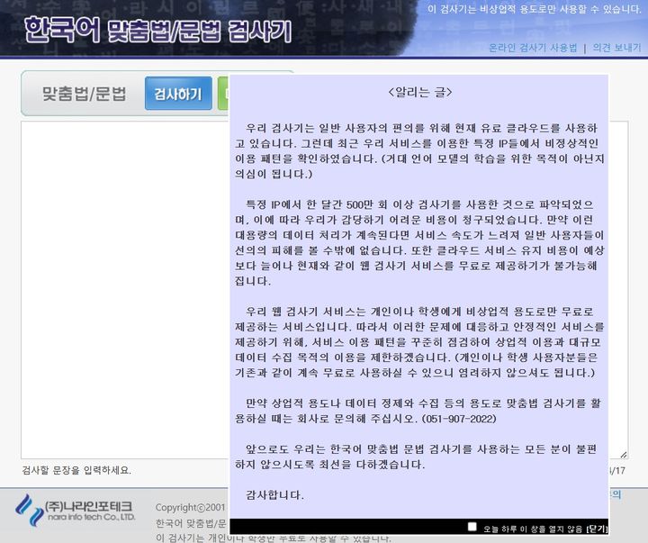 그는 "지난달에는 서버 이용 요금이 정상적으로 청구됐다"며 "향후에는 데이터 정제나 수집 등의 상업적 용도로 맞춤법 검사기를 사용하는 것에 제한을 둘 것"이라고 덧붙였다.
