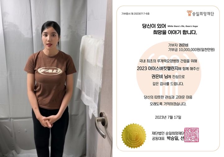 권은비는 17일 소셜미디어에 '2023 아이스버킷 챌린지'에 동참하는 짧은 영상과 함께 승일희망재단에 1000만원의 기부금을 전달한 증서를 게재했다.