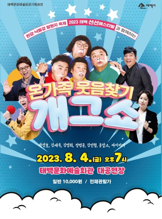[태백=뉴시스]김의석 기자 = 강원 태백시는 내달 4일 오후 7시 문화예술회관에서 지역 대표 축제인 한강·낙동강 발원지 축제 '선선 페스티벌'을 기념해 '온가족 웃음찾기 개그쇼'를 선보인다.