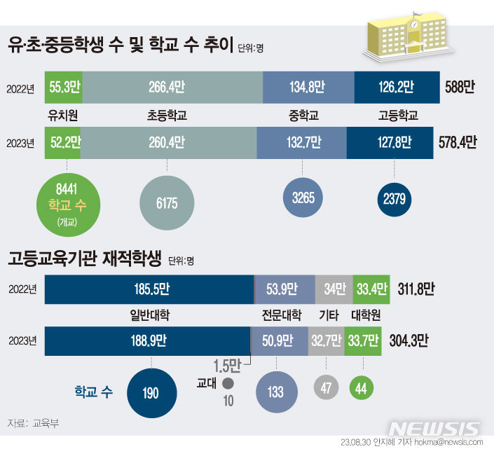교육부와 한국교육개발원(KEDI)는 전국 유·초·중·고·대학 2만2843개교의 기본사항을 조사한 '2023년 교육기본통계' 조사 결과를 30일 이같이 발표했다.