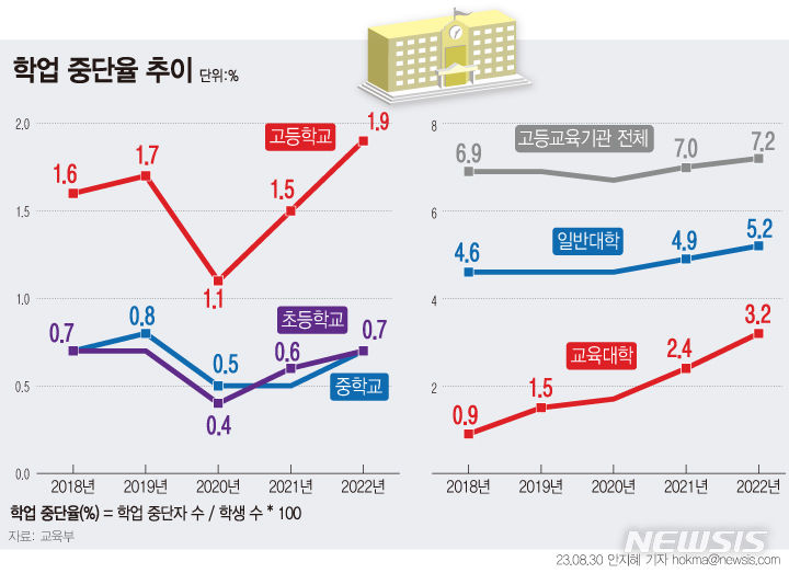 [세종=뉴시스]김정현 기자 = 초등학교부터 대학까지 학교를 그만둔 학생의 비율이 모두 상승했다. 교육대학(교대)은 통계 작성 이래 첫 3%를 넘었다.