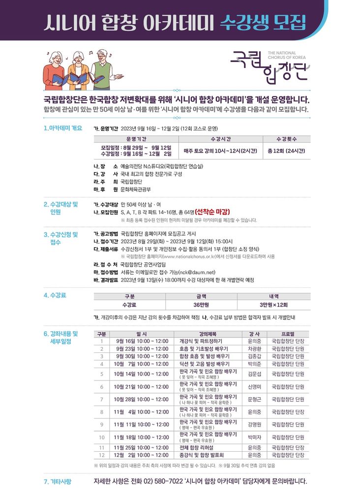 시니어 합창 아카데미는 오는 9월16일부터 12월2일까지 약 3개월 동안 운영된다.