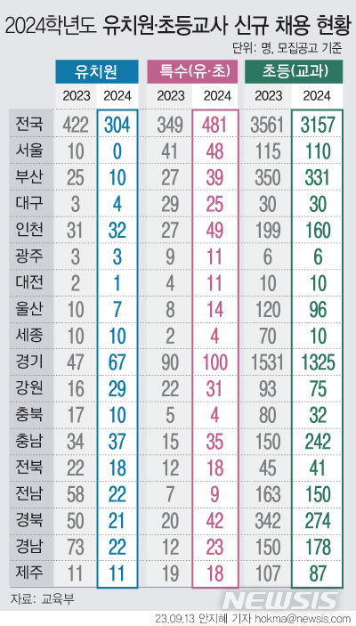 교육부는 13일 오전 각 시·도교육청이 홈페이지를 통해 발표한 '2024학년도 공립 유치원·초등·특수(유·초) 신규교사 임용시험 모집 인원'을 취합해 이같이 공개했다.
