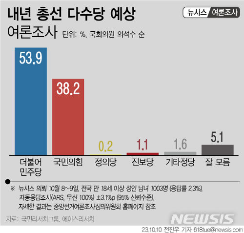 11일 뉴시스가 여론조사 전문기관 에이스리서치와 국민리서치그룹에 의뢰해 지난 8~9일 이틀간 실시한 내년 총선 전망 여론조사 결과 더불어민주당이 다수당을 차지할 것이란 응답은 53.9%를 기록했다.
