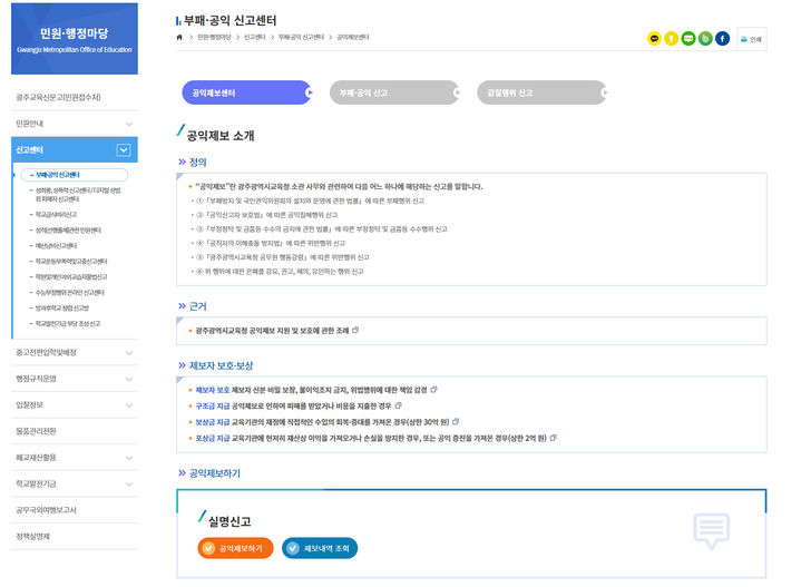 지연민은 시교육청 누리집 민원·행정마당-신고센터-부패·공익신고센터-공익제보센터를 통해 시교육청 소관 사무와 관련한 공익 침해 행위 등을 손쉽게 제보할 수 있다.