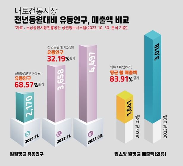 시장 상권 매출액도 크게 늘었다. 시장 내 의류 소매업(9종)의 월 평균 매출액은 전년 동기 대비 83.91%, 정육(3종) 매출액은 41.85% 증가했다.