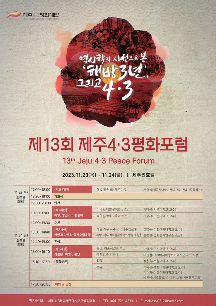 [제주=뉴시스] 양영전 기자 = '역사학의 시선으로 본 해방 3년, 그리고 4·3'을 주제로 한 제13회 제주4·3평화포럼이 23~24일 제주썬호텔에서 열린다.